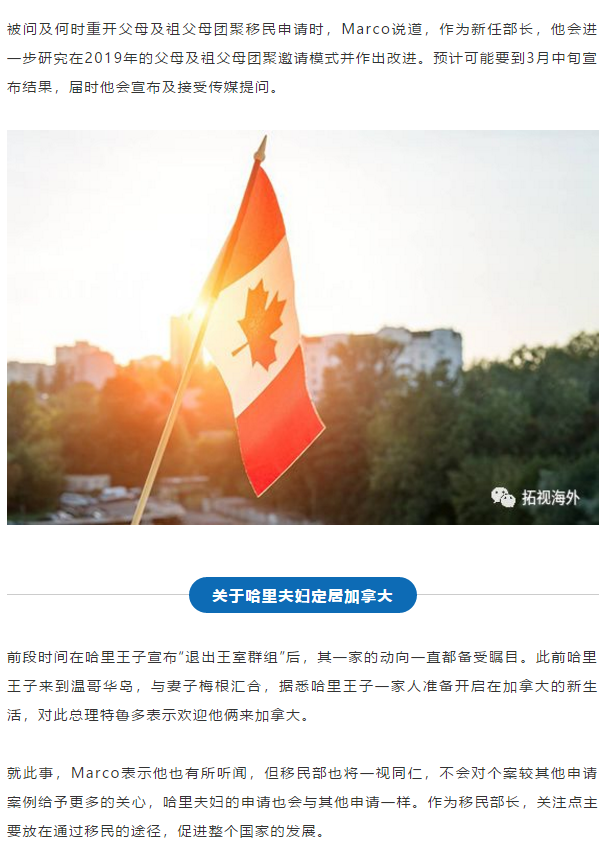 加拿大移民部長接受華媒專訪,繼續(xù)積極引進移民,父母團聚3月中出方案 2020-03-09 日前,加拿大移民部長Marco Mendicino接受華人媒體專訪,對華人們普遍關心的跨國生子、移民配額、父母和祖父母團聚、哈里夫妻的身份等問題回答華人媒體的提問,有很多有價值的信息透露。