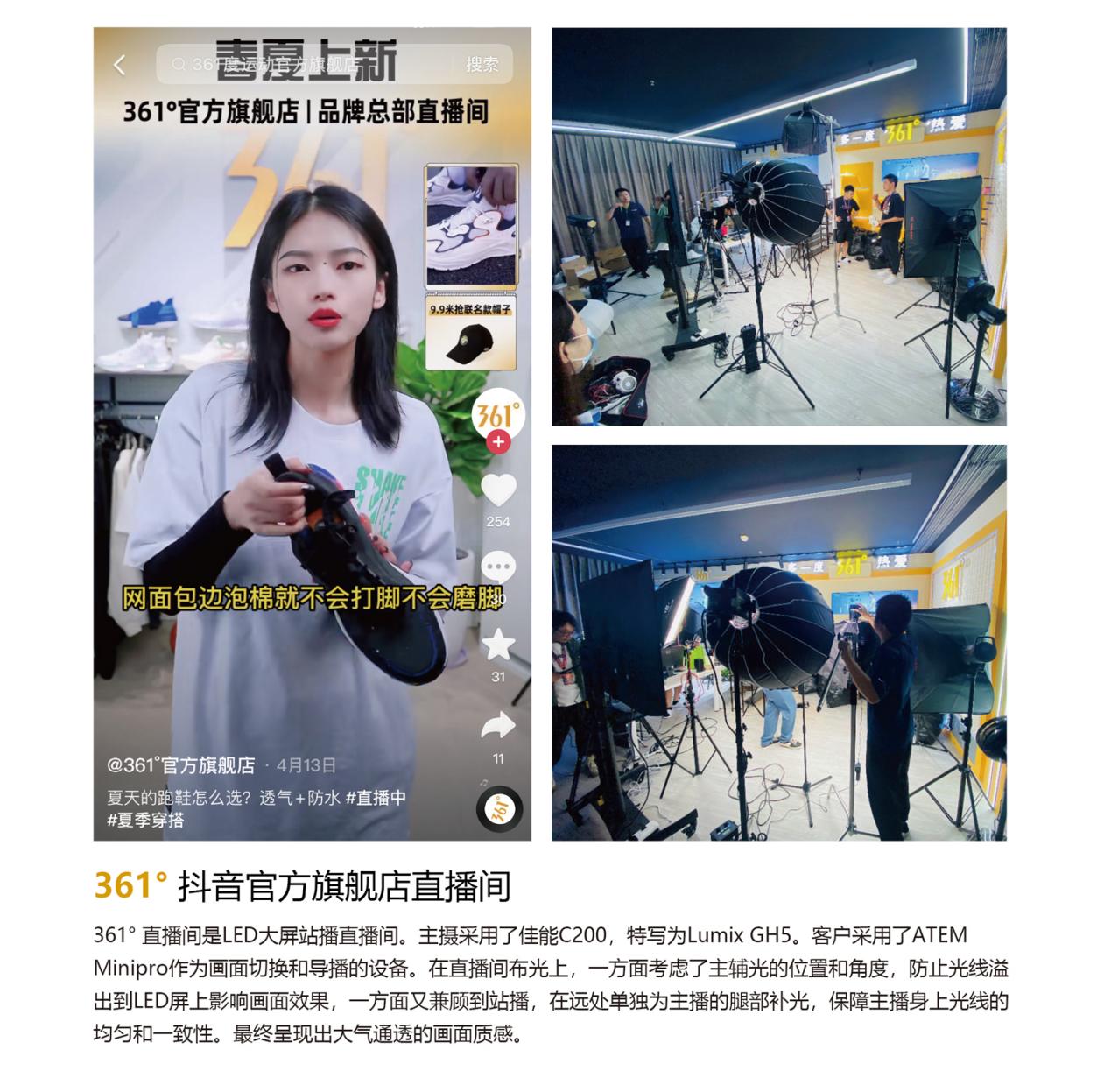 根據(jù)不同的場景化直播營銷需求,一視堅持不斷地探索與創(chuàng)新,陸續(xù)推出了實(shí)景、LED背景、虛擬背景等三種不同類型的直播間方案,著名運(yùn)動品牌361° 直播間是一個典型的LED大屏站播直播間。搭建時不僅配備了領(lǐng)先于市場的專業(yè)設(shè)備,主播、產(chǎn)品布光更講究層次重點(diǎn),既考慮了主輔光的位置和角度,防止光線溢出到LED屏上影響畫面效果,又兼顧到運(yùn)動鞋飾站播的特殊性,在遠(yuǎn)處單獨(dú)為主播的腿部補(bǔ)光,一方面保證主播身上光線的一致性,另一方面又兼顧到了產(chǎn)品打光。