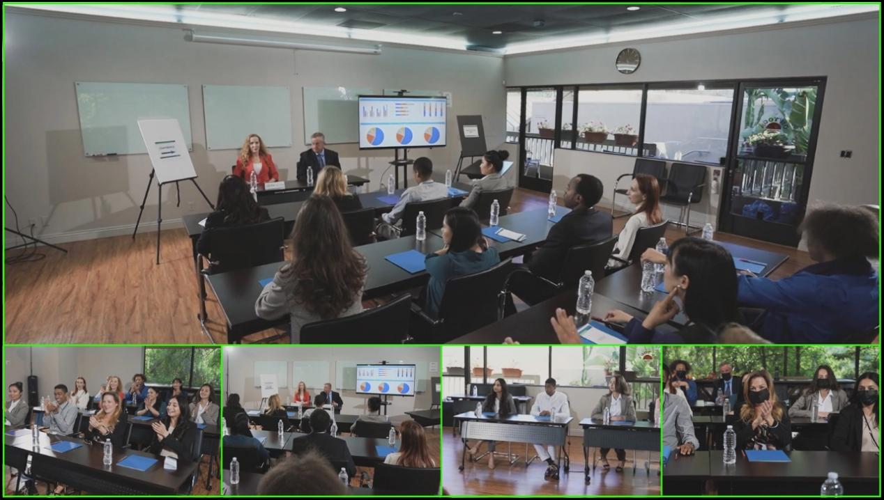 R5PRO 支持多路輸入源同屏顯示,例如會議全景側(cè)面特寫和人物近景的畫中畫效果,讓畫面呈現(xiàn)更加豐富,增強觀眾的視覺體驗