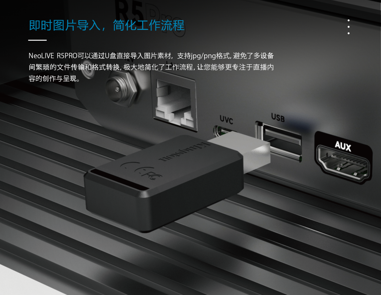 R5PRO 內(nèi)置硬件推流引擎,支持直接插入網(wǎng)線輸入密鑰,同步推流至抖音快手等平臺,確保畫質(zhì)高清不掉幀,告別卡頓尷尬同時支持 U 盤硬盤或 SD 卡直接錄制成片,大幅提升后期剪輯效率