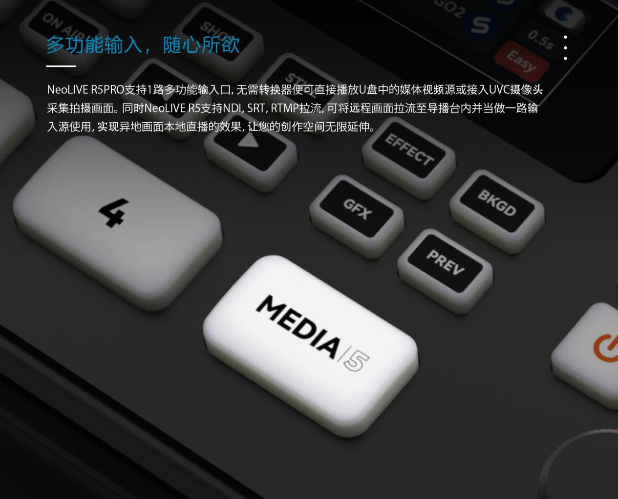 作為經(jīng)典產(chǎn)品 R2 Plus 的升級版,NeoLIVE R5PRO采用了全金屬機身設(shè)計,更加智能化的操作與更豐富的專業(yè)級功能,為直播與多機位創(chuàng)作帶來全新的升級體驗它不僅繼承了前代便攜流暢的優(yōu)勢,更通過第五路多功能輸入與遠程拉流技術(shù),實現(xiàn)多場景無縫銜接,讓直播內(nèi)容更豐富創(chuàng)作更自由