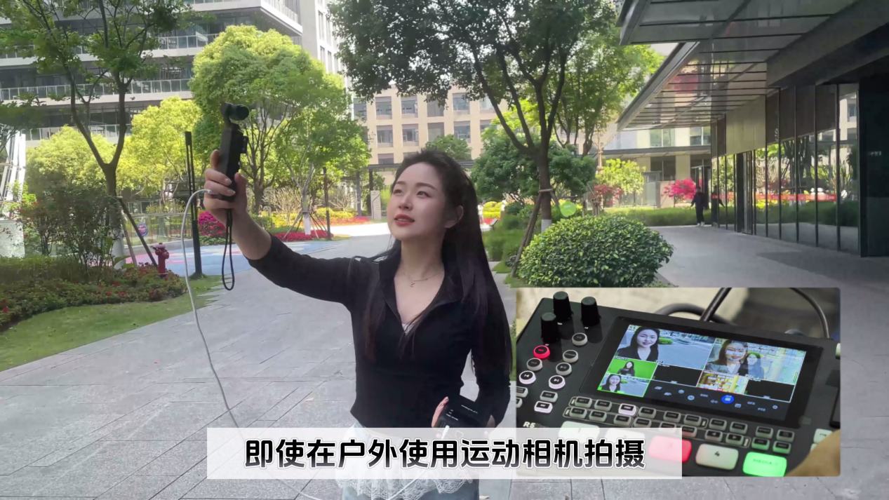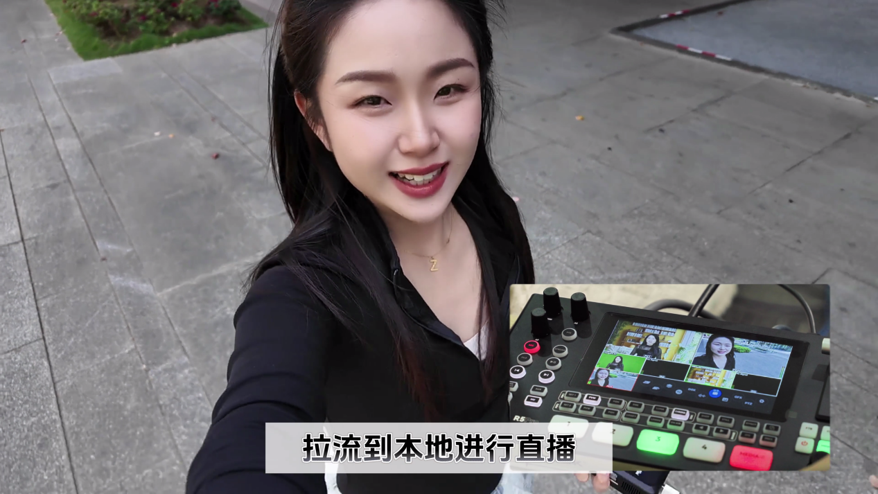 例如,在一場跨城市活動中,戶外團隊使用運動相機(如 DJI Pocket 3)搭配直播背包進行推流,再將拉流地址給到室內(nèi)直播間的R5PRO進行拉流,導播即可將運動相機的畫面作為一路輸入源,進行多機位的畫面切換